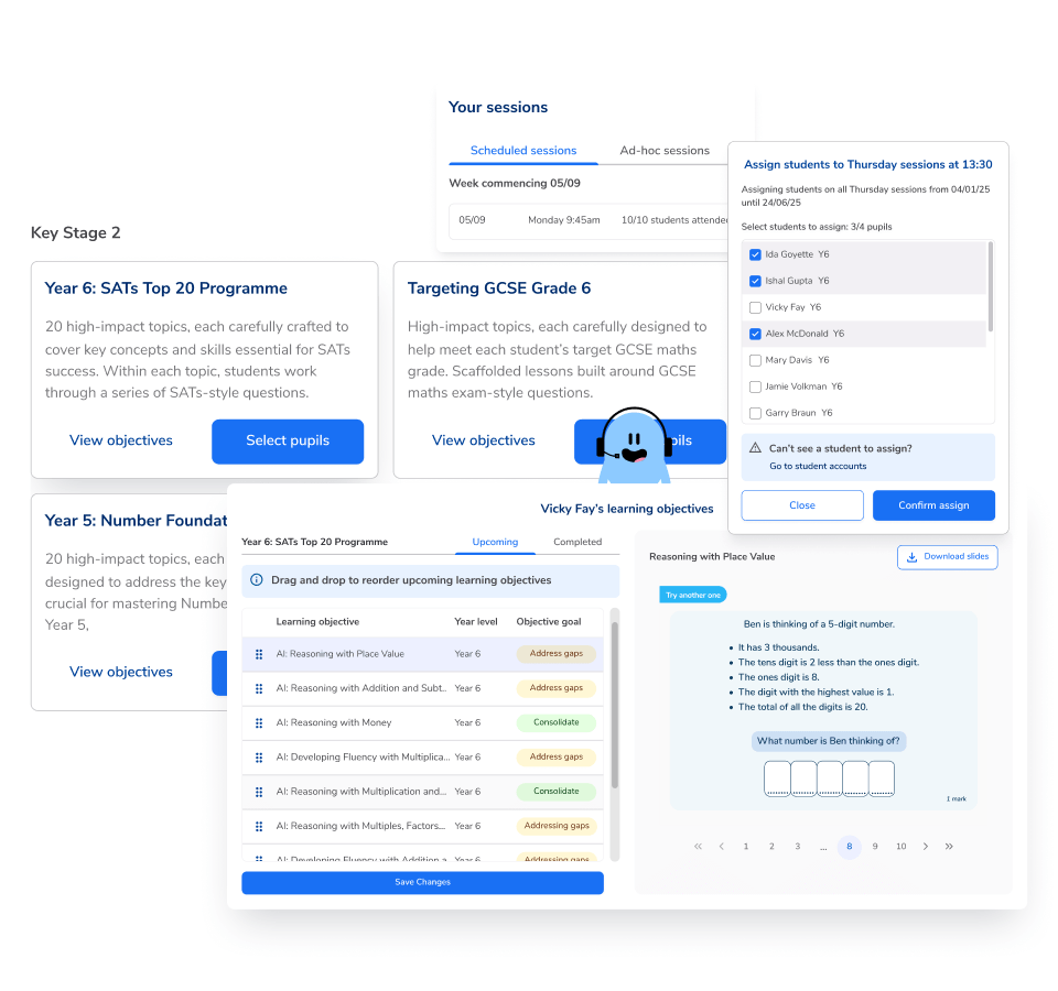 For secondary schools, AI online maths tutor Skye works with Year 10, 11 and resit students as they work through GCSE programmes aligned with their target maths GCSE grade.